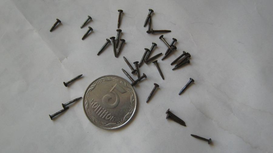 Цвяхи дрібні діаметр 1,0 мм, довжина 7мм та 9мм. Вага 140 г. Трохи окислені. Ціна 100грн