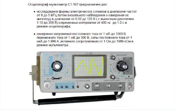 Осцилограф мультимір С1-107 - є універсальним приладом і дуже простий в користувані , що дозволяє використовувати для більш широкого кола задач, розробка і налагоджування ел. схем, вимірювання опору і сили як змінного так і постійного струму. Є технічна література. ціна 2500 гр. x.yurij@mail.ru